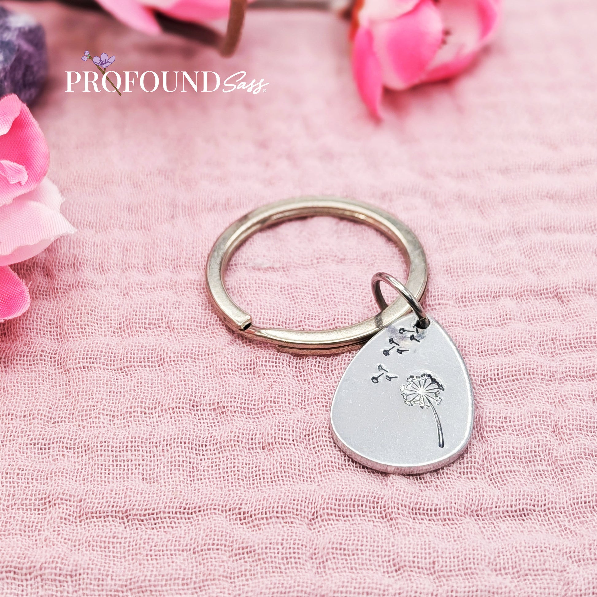 This wordless keychain features a stamped dandelion with drifting fluffs — a simple visual nod to wishes, change, and letting go.